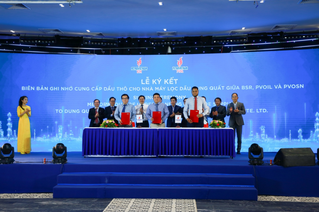 Ông Nguyễn Việt Thắng – Phó Tổng Giám đốc BSR; ông Nguyễn Đăng Trình – Phó Tổng Giám đốc PVOIL và ông Yomi Benson – Chủ tịch điều hành của PVOSN cùng ký kết biên bản ghi nhớ cung cấp dầu thô cho NMLD Dung Quất
