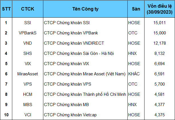 Top 10 công ty chứng khoán có vốn điều lệ lớn nhất thị trường.