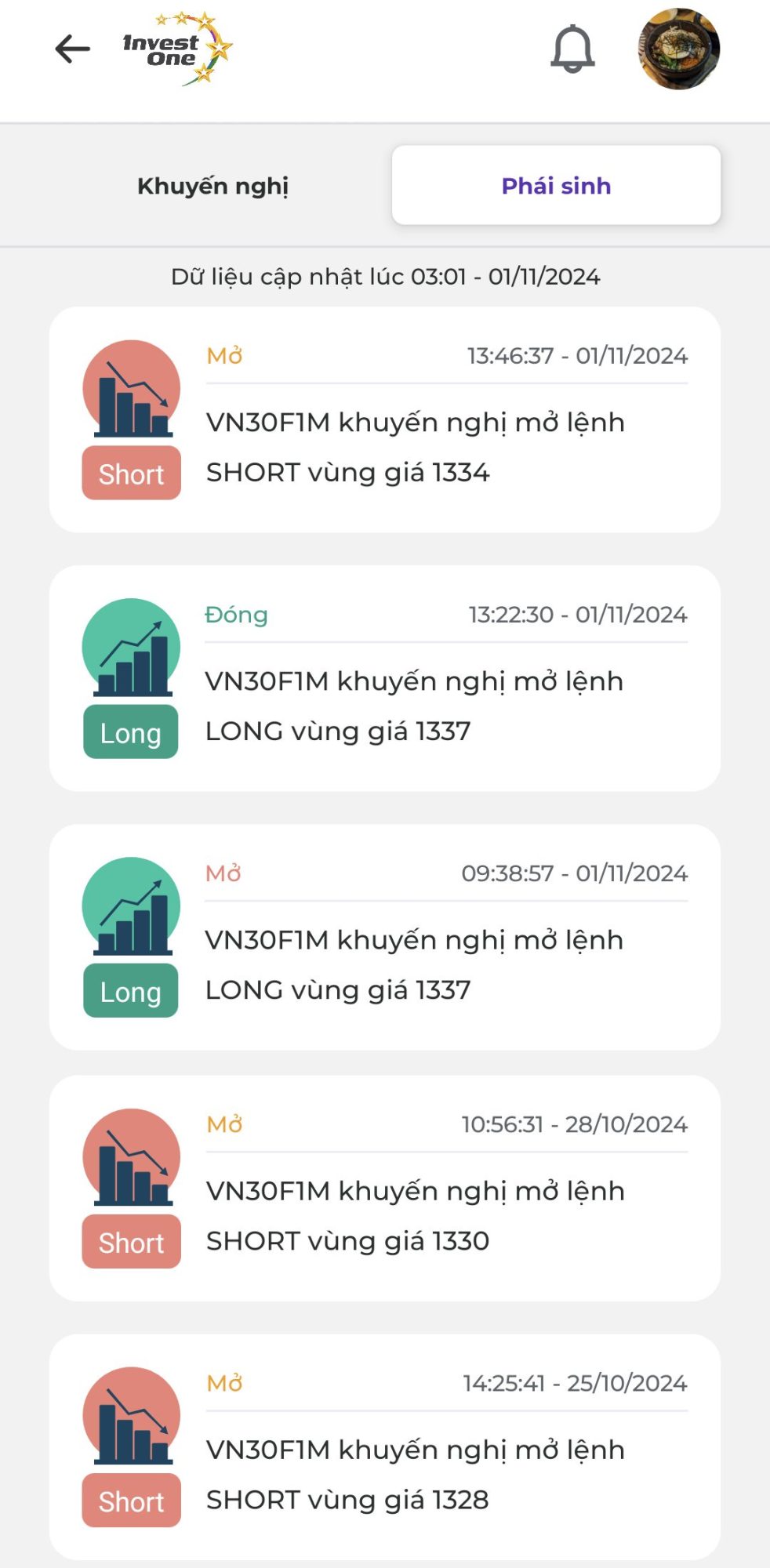 Hệ thống chúng tôi đã khuyến nghị một lệnh Mở Short VN30F1M tại vùng giá 1334 vào ngày 1/11. Với giá hiện tại là 1320, lãi tạm tính cho lệnh này đạt 14 điểm, chờ đóng lệnh chốt lãi vào phiên giao dịch tiếp theo.