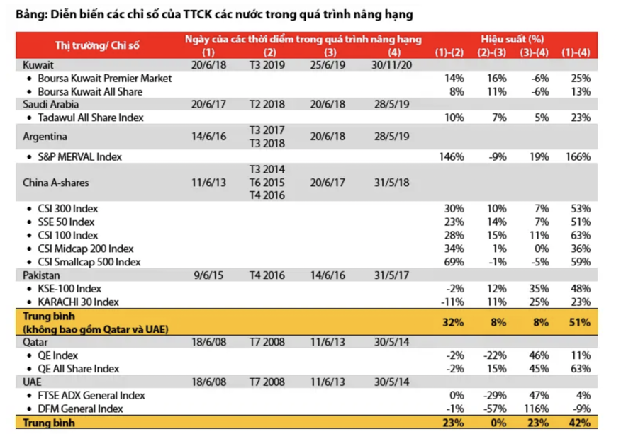 Theo thống kê từ các thị trường đã được nâng hạng không bao gồm Qatar và UAE do có sự kiện khủng hoảng tài chính toàn cầu khiến thị trường biến động mạnh và khoảng thời gian nâng hạng bị kéo dài, giai đoạn thị trường tăng mạnh thường diễn ra trong khoảng thời gian từ lúc được thêm vào danh sách theo dõi tiềm năng nâng hạng cho đến khi MSCI bắt đầu thực hiện tham vấn các tổ chức đầu tư trên thế giới với mức tăng trung bình là 32%.