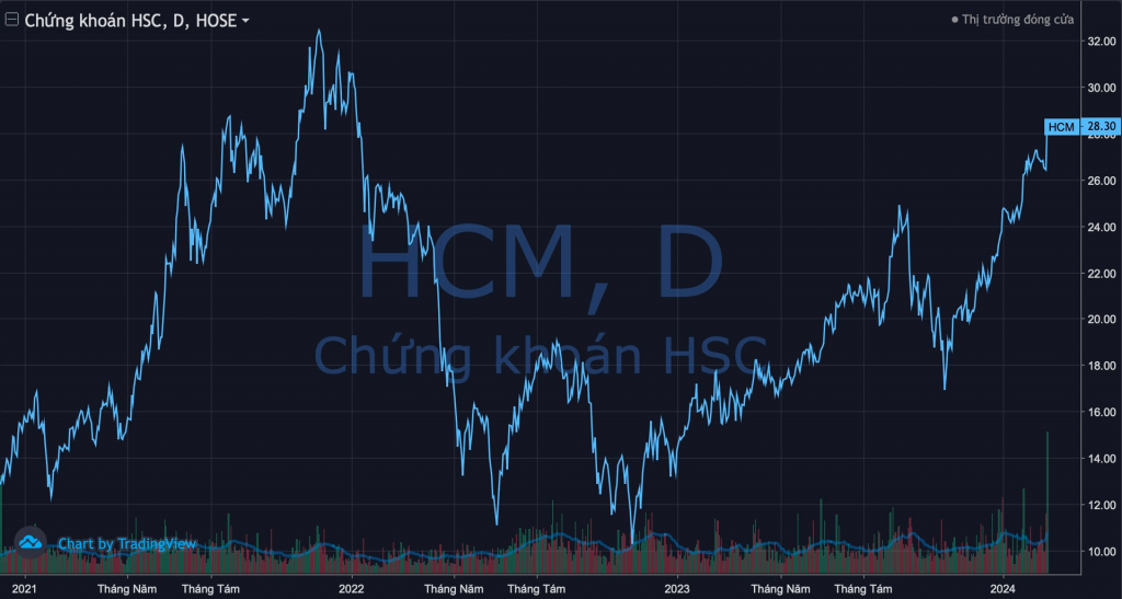 Phiên bứt phá mạnh đẩy thị giá HCM lên mức 28.300 đồng/cp, cao nhất trong hơn 25 tháng kể từ giữa tháng 1/2022. Sau gần 4 tháng nổi sóng (từ đầu tháng 11 năm ngoái), cổ phiếu này đã tăng gần 67%. Vốn hóa thị trường cũng theo đó tăng lên trên 21.300 tỷ đồng, chỉ còn kém khoảng 13% so với mức kỷ lục đạt được hồi cuối tháng 11/2021.