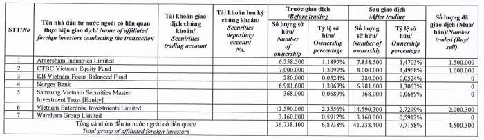 Sau giao dịch, sở hữu của cả nhóm quỹ tăng từ 36,73 triệu cổ phiếu (tỷ lệ 6,87%) lên 41,23 triệu cổ phiếu (tỷ lệ 7,71%). Trong phiên 23/1, cổ phiếu VCG ghi nhận giao dịch thỏa thuận hơn 2,5 triệu đơn vị với tổng giá trị hơn 64,41 tỷ đồng (giá mua bình quân 25.760 đồng/cp).