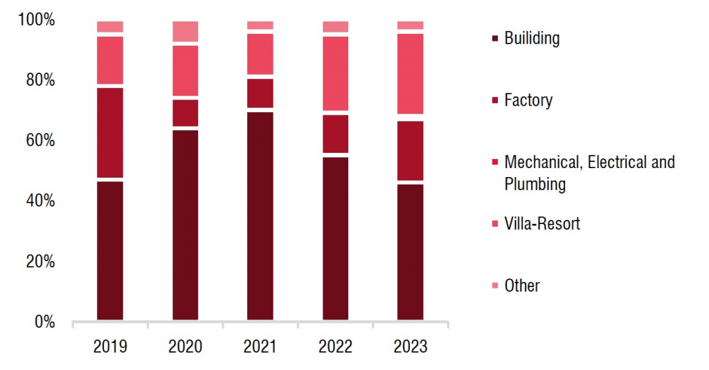 Cơ cấu backlog của Xây dựng Coteccons qua các năm. (Nguồn: Xây dựng Coteccons, SSI Research)