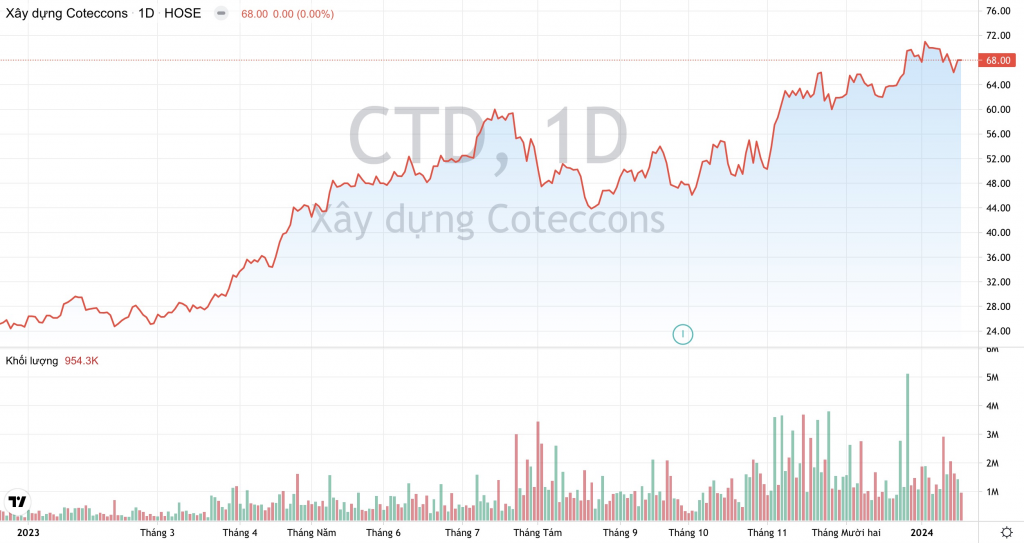 Khối lượng giao dịch và xu hướng giá cổ phiếu CTD của Xây dựng Coteccons từ đầu năm 2023 đến nay. (Nguồn: TradingView)
