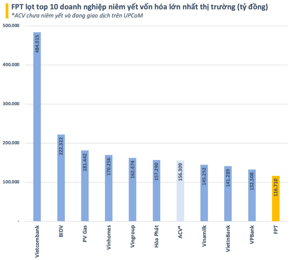Nếu tính cả các doanh nghiệp đại chúng chưa niêm yết đang giao dịch trên UPCoM, FPT sẽ đứng thứ 11 về giá trị vốn hóa thị trường. Bởi, UPCoM có một đại diện ưu tú là “gã khổng lồ” ngành hàng không ACV với quy mô vốn hóa lên đến 156.309 tỷ đồng (~ 6,5 tỷ USD). Con số này đưa ACV xếp thứ 7 trong top các doanh nghiệp lớn nhất toàn sàn chứng khoán.