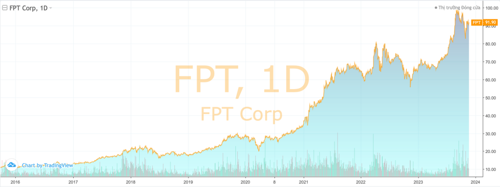 Con số 4,9 tỷ USD không phải là mức vốn hóa cao nhất mà FPT từng đạt được. Tại thời điểm đạt đỉnh lịch sử vào đầu tháng 9/2023, vốn hóa của doanh nghiệp công nghệ này lên đến 5,2 tỷ USD.