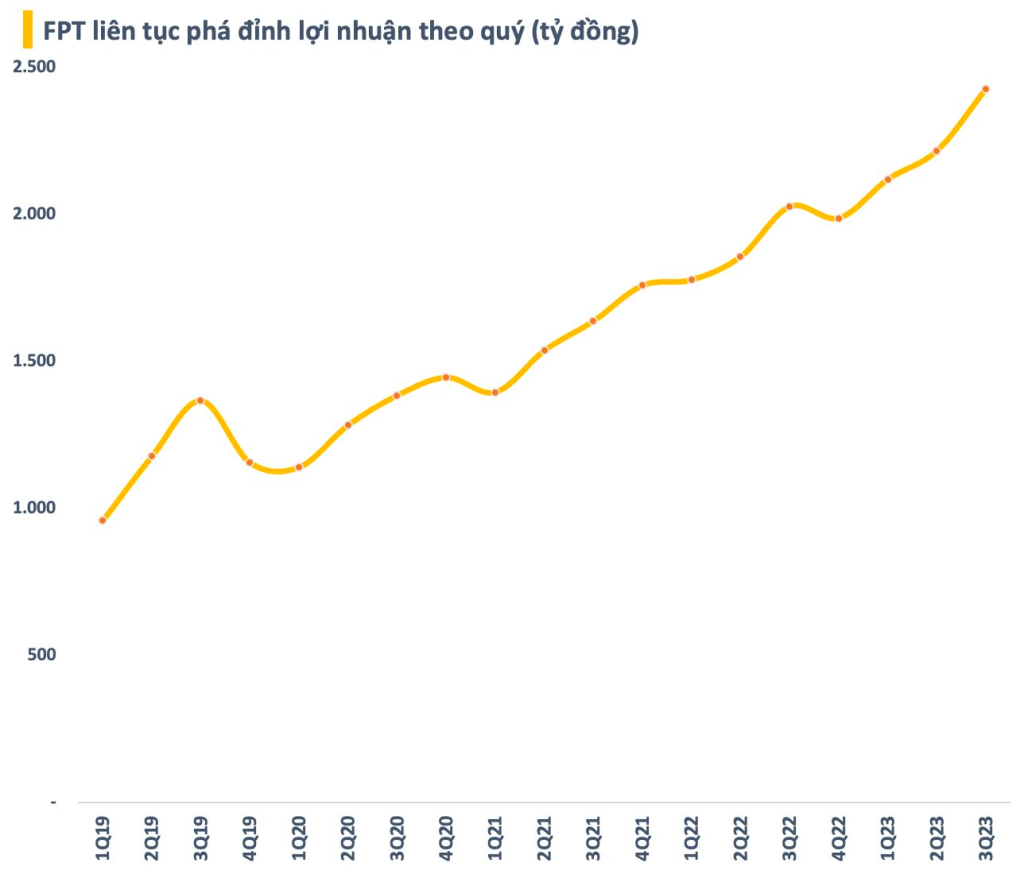 Trước đó, FPT đã tiếp tục phá kỷ lục lợi nhuận với lãi trước thuế quý 3 đạt hơn 2.400 tỷ đồng, tăng 20% so với cùng kỳ năm ngoái. Kết quả này nối dài chuỗi tăng trưởng lợi nhuận theo quý so với cùng kỳ tập đoàn này. FPT cũng là doanh nghiệp hiếm hoi duy trì được thành tích này trong nhiều năm qua.