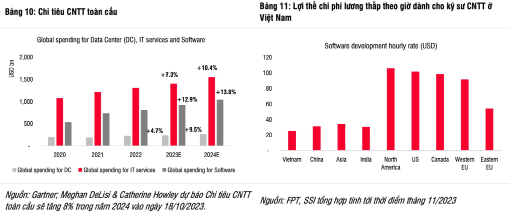 Tuy nhiên, SSI Research cũng kỳ vọng việc chi tiêu CNTT chậm lại trong năm 2023 sẽ thúc đẩy tăng trưởng chi tiêu CNTT trong năm 2024. Theo Gartner, chi tiêu CNTT toàn cầu dự kiến sẽ tăng 8% trong năm 2024, theo đó mức tăng trưởng cho Trung tâm dữ liệu, dịch vụ CNTT và Phần mềm lần lượt là 9,5%, 10,4% và 13,8% (so với mức 4,7%, 7,3% và 12,9% trong năm 2023).