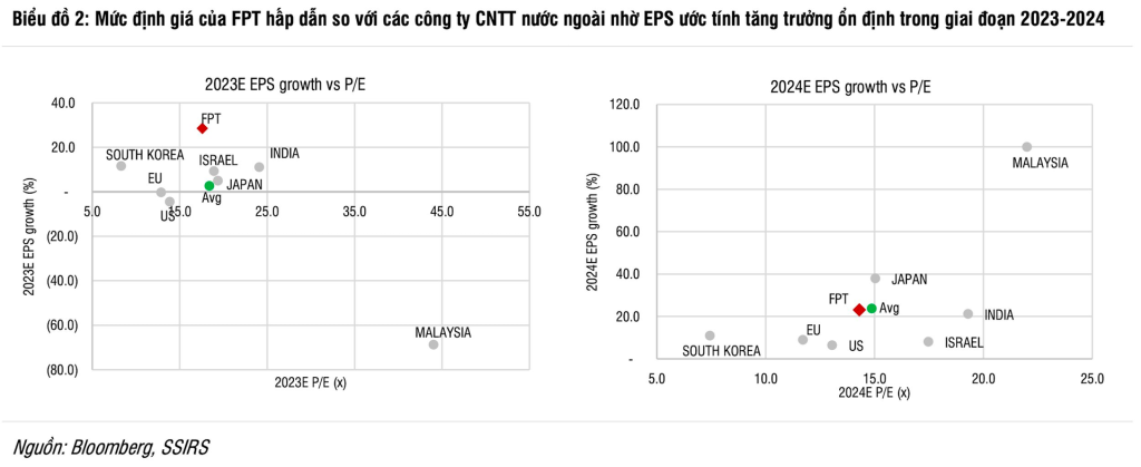 Nhìn chung, SSI Research dự phóng LNTT của FPT sẽ tăng trưởng 19% svck trong năm 2023 và 21% svck trong năm 2024. Nhờ EPS ước tính tăng trưởng ổn định trong giai đoạn 2023-2024, mức định giá của FPT được cho là hấp dẫn so với các công ty CNTT nước ngoài dù cổ phiếu vẫn đang gần đỉnh lịch sử.