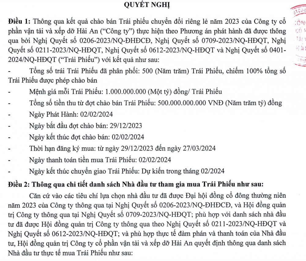Công ty CP Vận tải và xếp dỡ Hải An (HOSE: HAH) mới đây đã công bố hoàn tất chào bán 500 tỷ trái phiếu riêng lẻ vào ngày 2/2/2024.