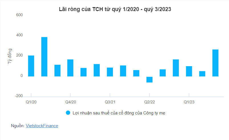 Trong quý cuối năm 2023, TCH báo lãi ròng gần 270 tỷ đồng, gấp 3.6 lần cùng kỳ. Qua đó, vượt 32% chỉ tiêu lãi sau thuế sau 9 tháng.