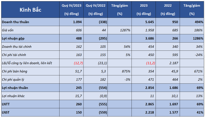 Lũy kế cả năm 2023, doanh thu thuần của Kinh Bắc đạt 5.645 tỷ đồng, tăng 494% so với cùng kỳ năm 2022, với biên lợi nhuận gộp 65%. Lợi nhuận sau thuế đạt 2.218 tỷ đồng, cũng là mức cao nhất kể từ khi niêm yết từ năm 2007 đến nay.