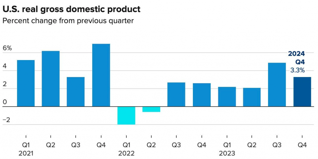 Theo báo cáo của Bộ Thương Mại Mỹ vào hôm thứ Năm, GDP của nền kinh tế số 1 thế giới tăng 3,3% trong quý 4/2023, dựa trên dữ liệu được điều chỉnh theo mùa và theo lạm phát.