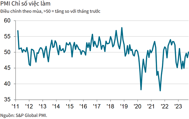 Việc làm hầu như không thay đổi vào đầu quý cuối của năm, từ đó kết thúc thời kỳ giảm việc làm kéo dài 7 tháng. Những thành viên nhóm khảo sát tăng số lượng việc làm cho biết lý do làm như vậy là để đáp ứng số lượng đơn đặt hàng mới tăng, trong khi vẫn còn tâm lý lạc quan về triển vọng sản lượng trong một năm tới.