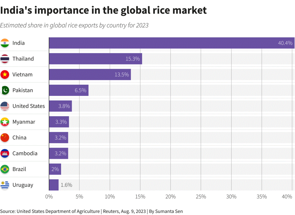 Ấn Độ, nước xuất khẩu gạo lớn nhất thế giới, đang tập trung cao độ cho việc sản xuất, sau khi New Delhi cấm xuất khẩu gạo trắng non-basmati từ tháng 7, khiến giá gạo toàn cầu tăng vọt.