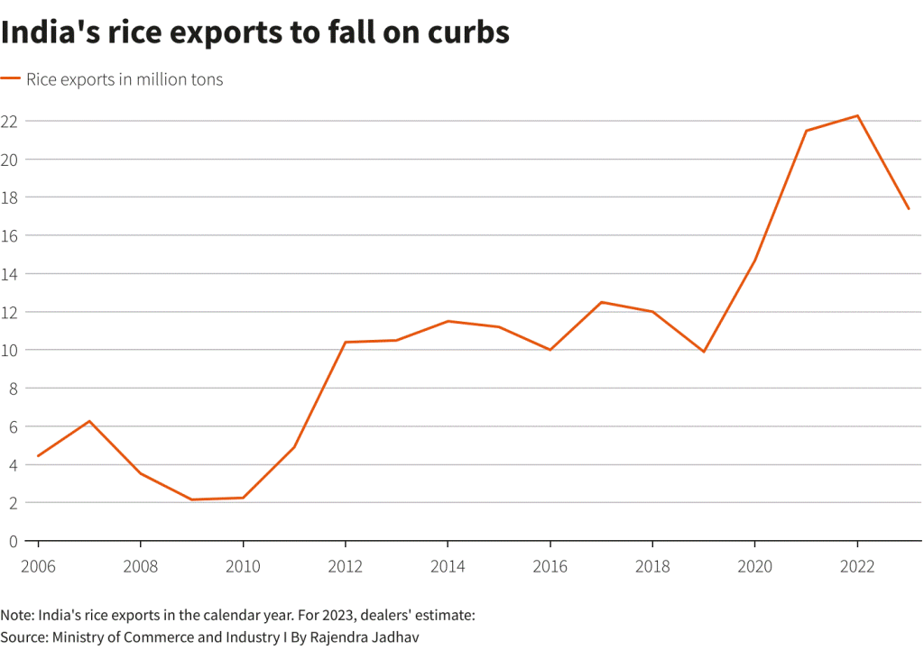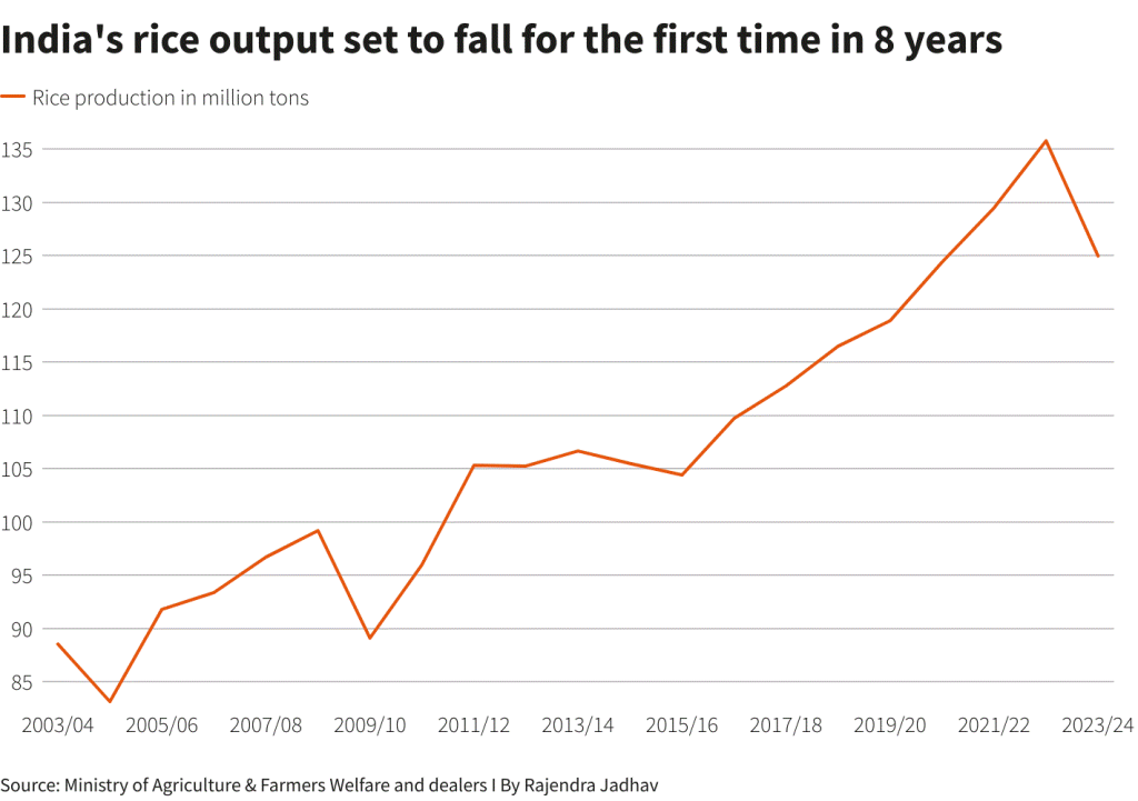 Mất mùa lúa đã và đang trở thành vấn đề lo ngại của các chính phủ và người tiêu dùng trên khắp châu Á và châu Phi, những người đang phải vật lộn để đảm bảo nguồn cung mặt hàng lương thực chủ lực vì giá trên thị trường toàn cầu tăng lên mức cao nhất trong 15 năm sau khi Ấn Độ – quốc gia chiếm 40% tổng sản lượng gạo toàn cầu – hạn chế xuất khẩu gạo. Việc hạn chế xuất khẩu kéo dài có thể làm tăng thêm giá thực phẩm trên toàn cầu, do lượng tồn trữ ở các nước xuất khẩu chủ chốt khác, bao gồm Thái Lan, Việt Nam, Pakistan và Myanmar, cũng đang ở mức thấp.
