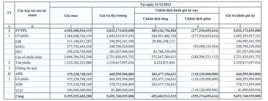 Tại thời điểm cuối năm 2023, EIB, MWG, FRT đang là những mã nổi bật trong danh mục tài sản FVTPL của SHS.
