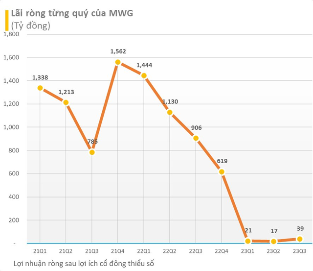 Kết quả, MWG đã thu về 182 tỷ đồng lợi nhuận trước thuế, giảm 87% so với cùng kỳ năm trước. Lợi nhuận sau thuế cổ đông công ty mẹ đạt 38,7 tỷ đồng, giảm 96% so với năm trước. Tuy nhiên, mức lợi nhuận này lại gấp đôi so với quý 2 liền kề trước đó. EPS giảm từ 618 đồng về còn 26 đồng.