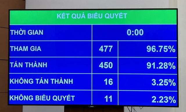 Kết quả biểu quyết điện tử cho thấy có 450 đại biểu tham gia biểu quyết tán thành, chiếm tỉ lệ 91,28%.
