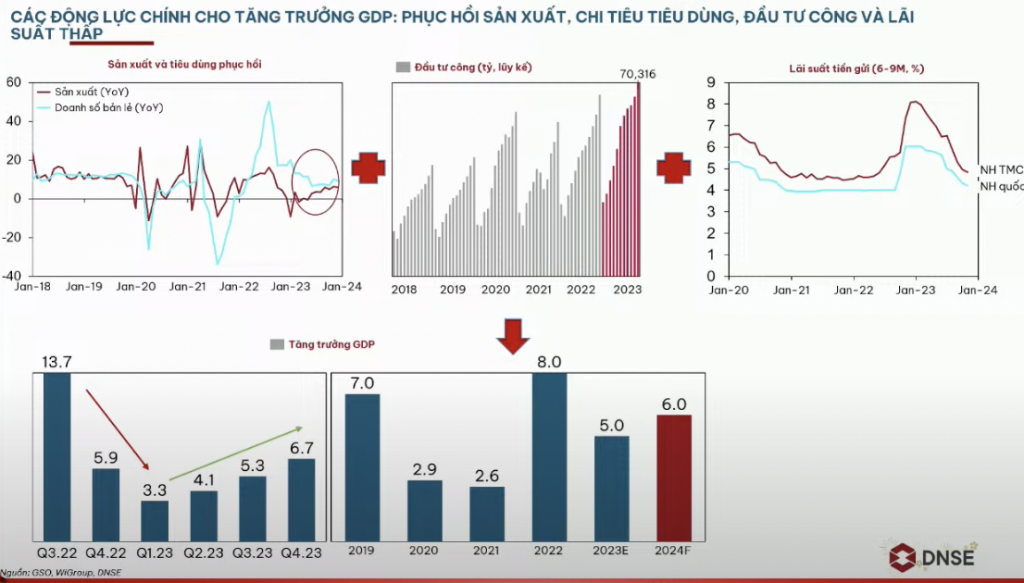 Với các động lực chính cho tăng trưởng GDP năm 2024 đến từ phục hồi sản xuất, chi tiêu tiêu dùng, đầu tư công và lãi suất thấp, chuyên gia DNSE kỳ vọng GDP năm 2024 tăng trưởng cao hơn năm 2023 ở mức 6%.