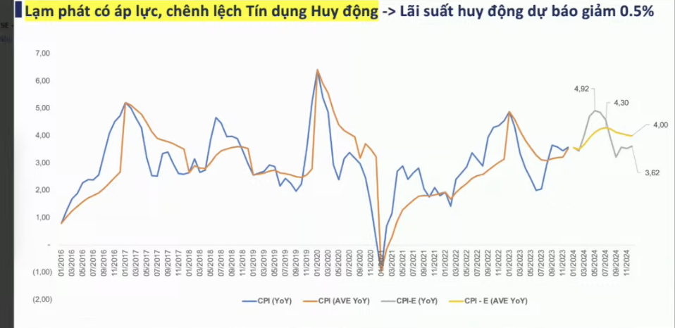 Đưa ra góc nhìn thận trọng hơn về chỉ số vĩ mô, ông Trần Ngọc Báu – Nhà sáng lập, Giám đốc Điều hành WiGroup cho rằng áp lực lạm phát năm 2024 có thể tăng cao hơn mức ổn định năm 2023. Lạm phát có thể tăng mạnh từ quý 2/2024 từ mức nền thấp trong cùng kỳ, thậm chí có thời điểm lạm phát có thể lên đến 4,5-4,9%. Tuy nhiên, vị chuyên gia cho rằng lạm phát cuối năm có thể giảm về vùng 3,6%-3,8%.