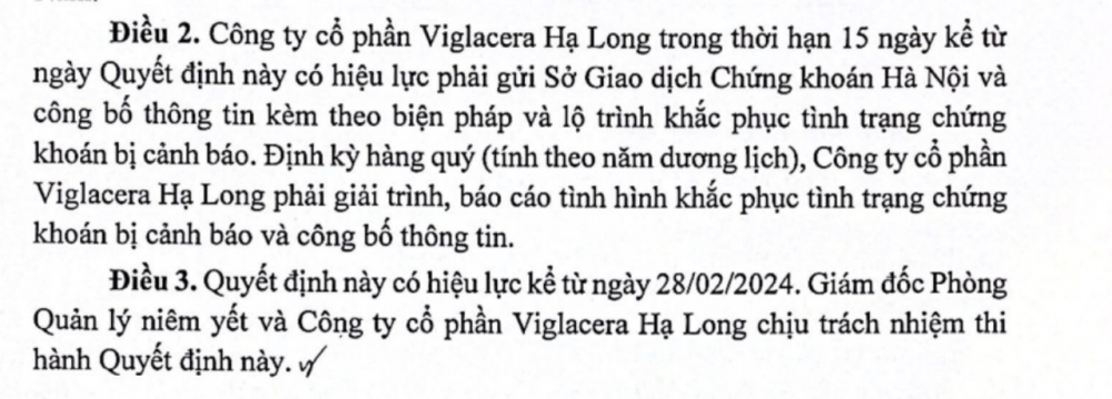 Tuy nhiên, CTCP Viglacera Hạ Long vẫn có thể thoát khỏi tình trạng trên, nếu 15 ngày sau, kể từ ngày quyết định có hiệu lực là 28/02, VHL phải gửi HNX và công bố thông tin kèm theo biện pháp, lộ trình khắc phục tình trạng chứng khoán bị cảnh báo.