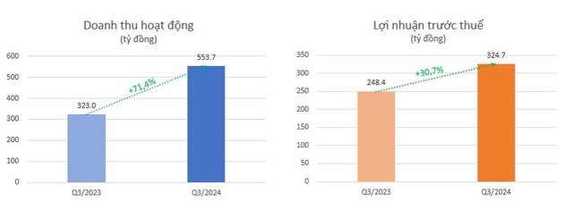 Doanh thu hoạt động và lợi nhuận trước thuế Quý 3/2024 so với cùng kỳ của Chứng khoán VIX tăng trưởng lần lượt là 71,4% và 30,7%.